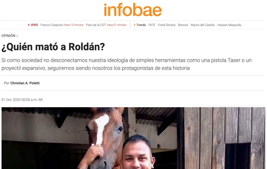 Con Rodrigo Roza, su agresor, pasó lo que suele pasar. Ya murió. Porque eso es lo que hace una bala de 9 mm como las que disparan los policías argentinos. Ocasionan la muerte ya que son proyectiles diseñados para eso, para perforar y lesionar, y seguir perforando y seguir lesionando. Y eso fue lo que pensó Juan Pablo Roldán al dispararle, o mejor dicho al dudar en hacerlo. Pensó en su compañero, que estaba atrás del agresor en la línea de fuego, pensó en la gente que también se encontraba cercana, pensó en su arma y en el poder de sobrepenetración del proyectil que tiene obligación de portar. Roldán no quería matar a Roza, simplemente quería evitar que siguiera agrediéndolo. Y sin embargo, Roza murió varias horas después de ocasionarle las heridas que terminaron con su joven y prometedora vida.